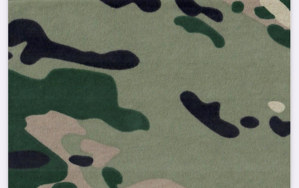 Кулирное полотно камуфлированной расцветки. Самые популярные принты для военной производственной отрасли: цифра пиксель, серый мох, зеленый мох, мультикам. Качество Open End. Ширина рулона 185 см, плотность 150 гр/м2. Из 100% хлопковой пряжи. Трикотажное полотно КМФ подходит для пошива нательного белья, футболок, шорт, а также домашней одежды в стиле милитари.